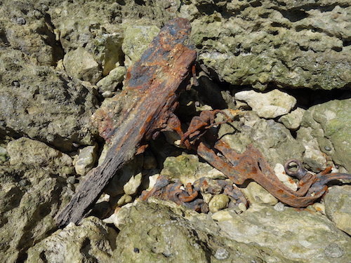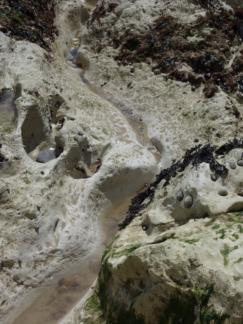One has to walk carefully over the rocks. It encourages looking down and slow observation. There is great beauty and interest. The metal object must have come from a ship. It’s about a metre long. It’s not obvious from the photograph, but part of it is made of wood, which has been severely burnt. An explosion? There are many wrecks off the coast here.