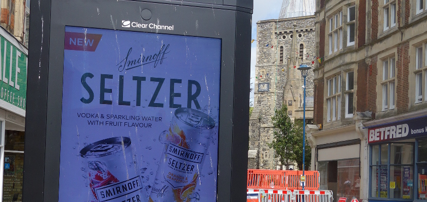 Clear Channel is another global company with interests in the UK. It controls 35,000 sites which display advertising 24 hours a day. The claim of ‘Platform for Good’ is theirs. The advertising is of a type of drinks which have been criticised for encouraging under-age drinking.