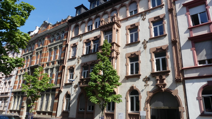 The balcony is a little Renaissance. What were the local builders thinking of? There is nothing obvious to compare the urban and industrial development of Offenbach in the latter years of the nineteenth century with the Italian cities of the fifteenth. And Adolf Loos would be getting rather cross with all those griffins.