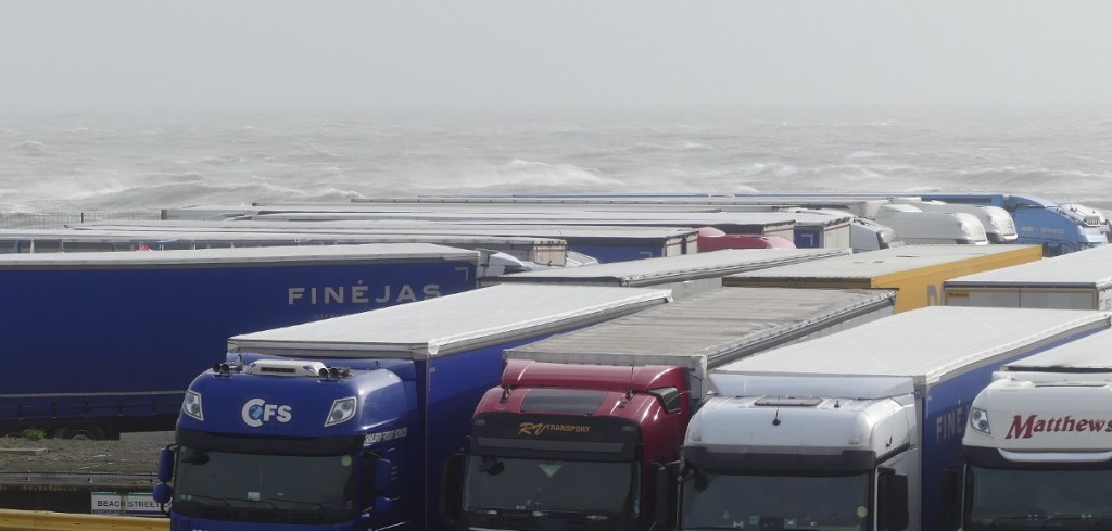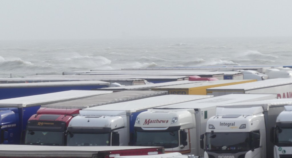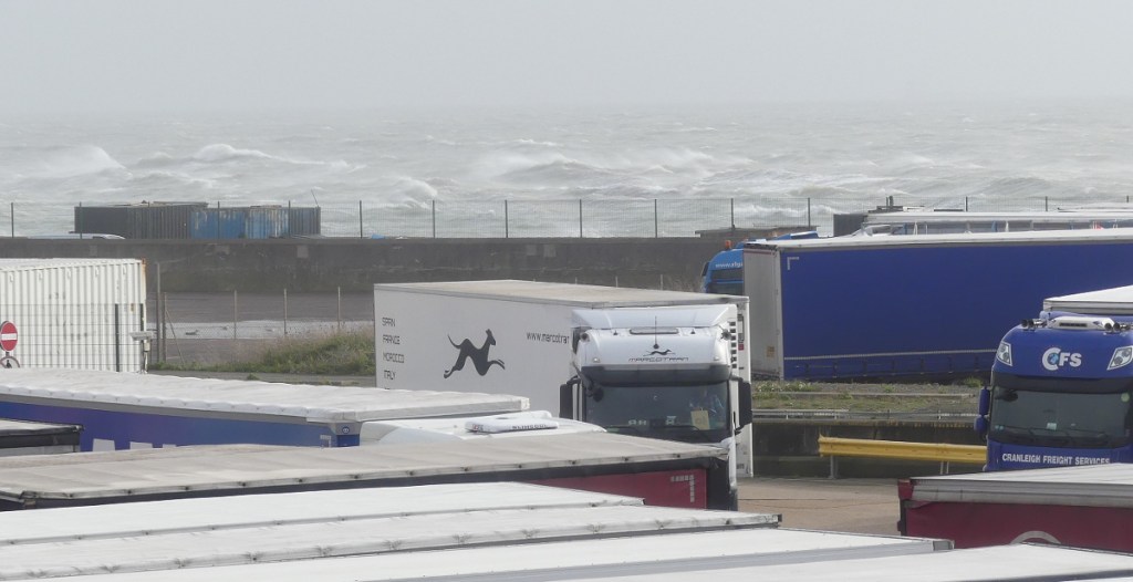 The trucks below are parked up at MOTIS in Dover. There’s a canteen, facilities for truck drivers, safe parking, custom clearance facilities. The drivers often go down to the sea to get some exercise and air.