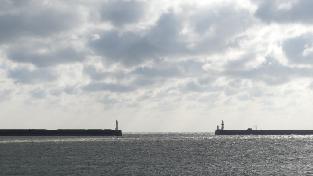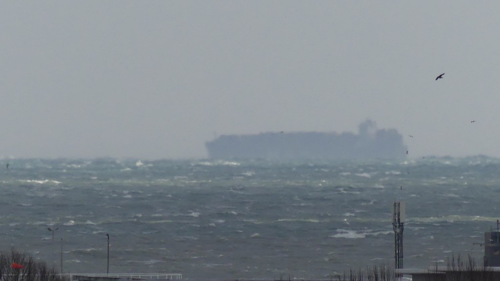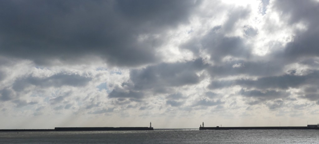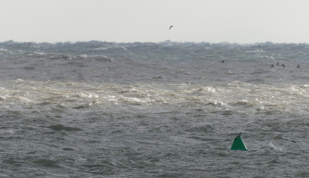 It looks as if the sea has ice floes but it’s just the white caps of the waves. The light was thick at times. On occasion, direct sunlight came through the clouds, turning the sea silver.