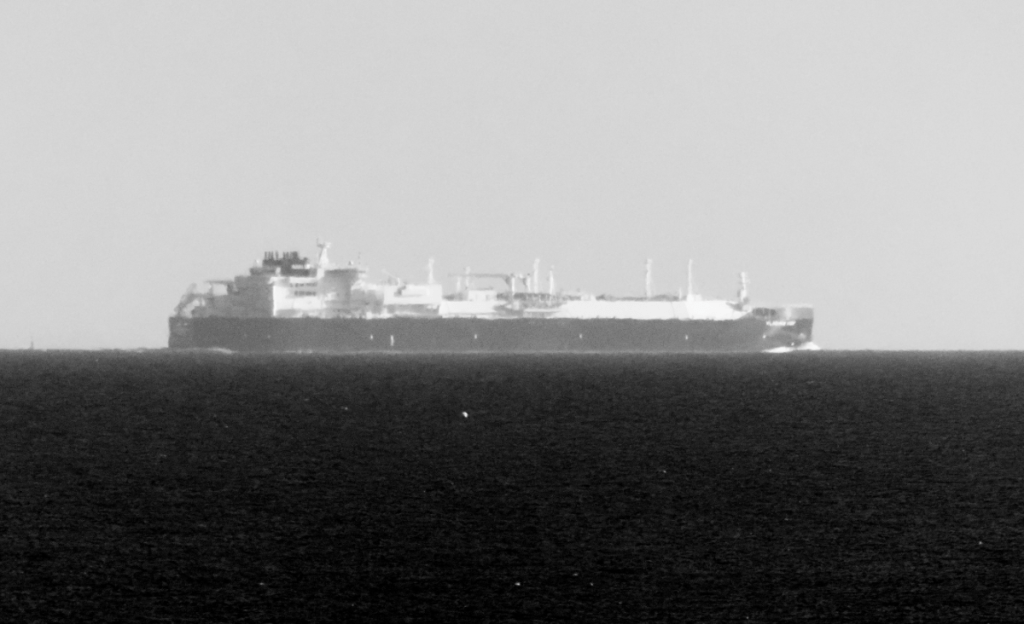 The LNG tanker Vladimir Vize on route to Montoir, France from the Russian port of Sabetta. The port was opened in 2017 and has played a key role in the increase of shipping in the Arctic waters. As the ice continues to melt, more shipping is using the far north routes. The Vladimir Vize is one of fifteen ice-breaking LNG tankers.