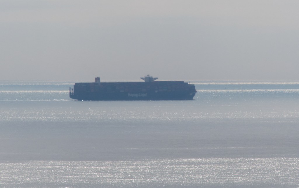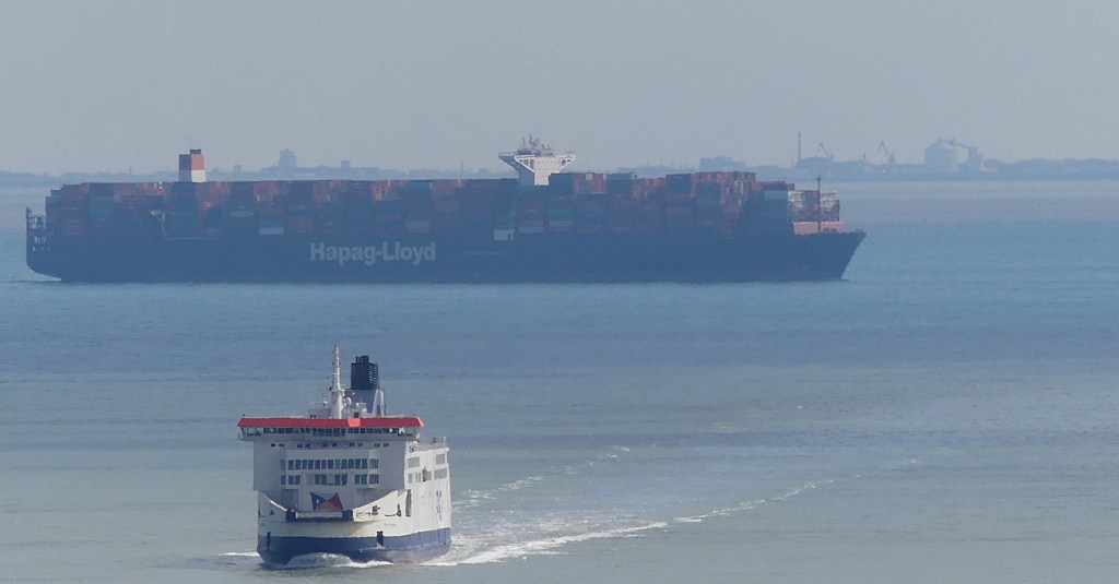 The container ship Al Zubara with a capacity of 19,000 TEUs. On its way from Rotterdam to Southampton. The port of Calais on the French coast. The ferry gives some sense of scale.
