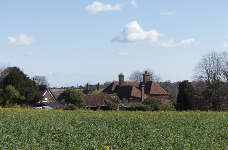 Across the fields.
