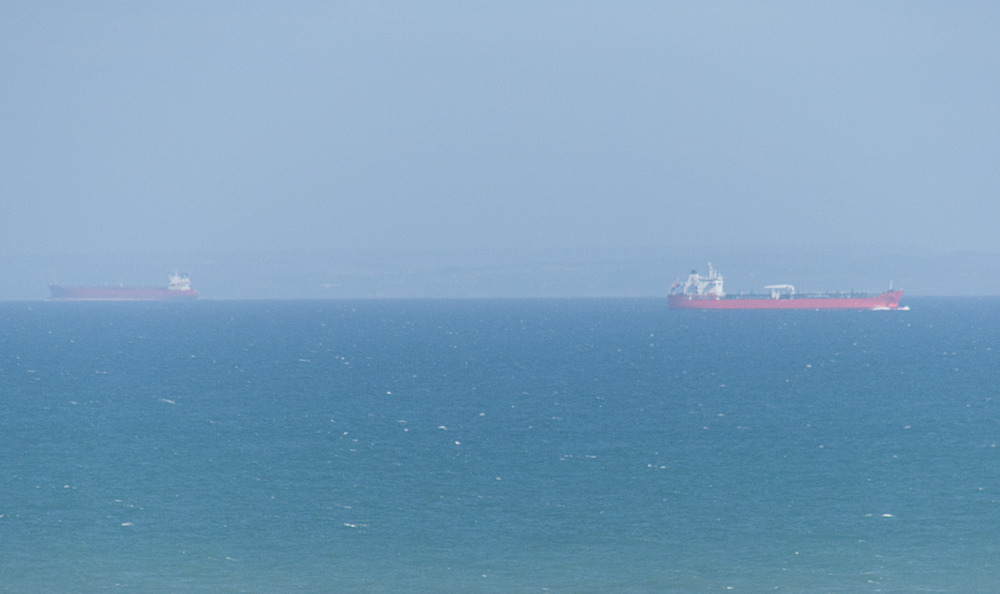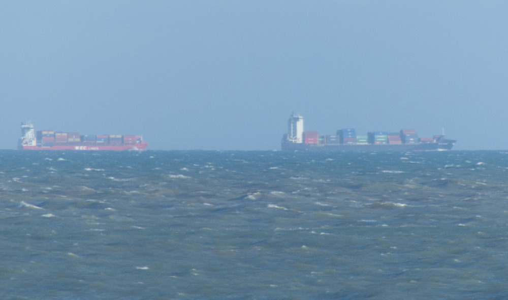 The container ship on the left is the Wec Vermeer sailing from Antwerp to Lexixoes. The container ship on the right is the Baltic Fulmar sailing from Dunkirk to Bilbao.