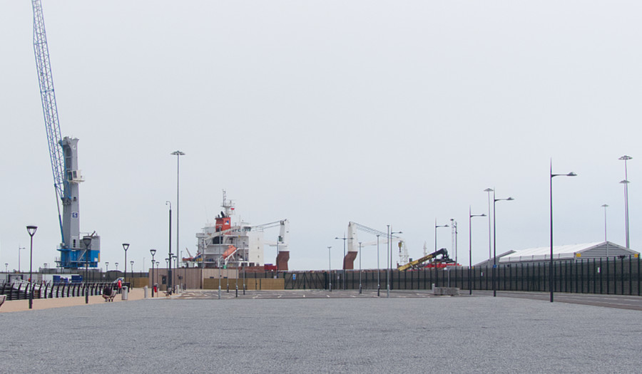 Here we can see the domination of electrically powered hydraulic cranes. One crane operator replacing several gangs of dock workers.