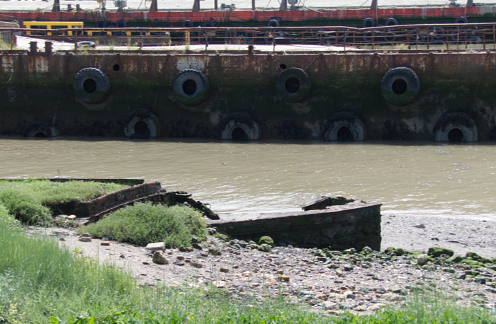 This was once a landfill site. The foreshore is covered with bottles, broken glass and china, decomposing car batteries and general consumerist debris. It has been described as a toxic time bomb. Pollutants continue to leach into the Thames.