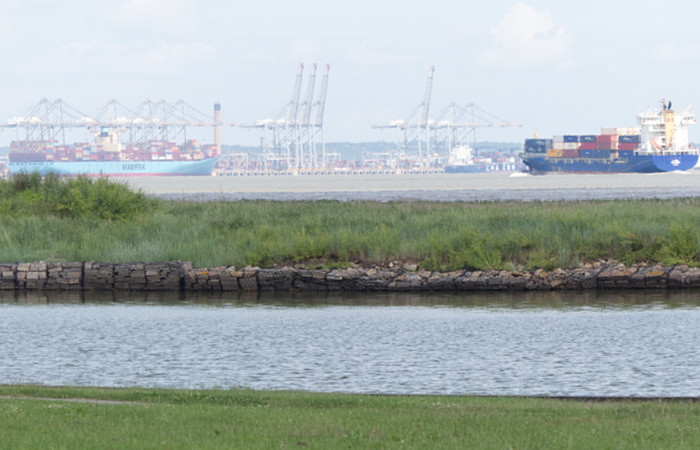 DP World London Gateway. The ships are the Eleonora Maersk, Marseille (in port) and Elbsun in the river sailing to Bilbao.