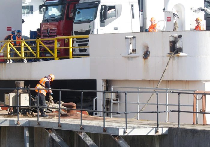 I meet him one more time when its time to board the ferry. He’s in the driving seat, I’m sitting in the back. The other guy is trying to work out how I’ll get on the ship. In between radio communications they are talking about people they work with, things that are going on in the port. The instruction comes over the airwaves, I can use the sky walk.
