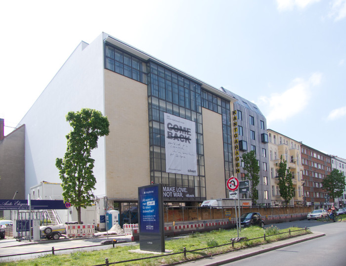 Kantstrasse is great fun. Full of restaurants, bars, shisha lounges, barbers, nail bars, shops selling all that stuff which you can never imagine anyone buying. It’s lively and full of people, many eating very early lunches. The first building I’m looking for is Kantgaragen which was built in 1930 and is one of the few Bauhaus industrial buildings still extant. It’s a building site at the moment. There’s a guy on a mobile phone. I really want him to move out of the way so I can take a photograph and I want to ask him some questions. This doesn’t work out. He keeps looking at me warily as I hold the camera. He moves out of my sight line and I take the pictures. But he’s still there talking to someone and now moves right away. I don’t think he wants me to hear the conversation. I would have liked to ask him what was going on with the building.
