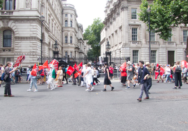 The Scottish Fire Brigade Union have pipers and drummers. Equity members all wear white. There’s a drum band banging out a might opposition. Union banners, hand made posters, bits of cardboard. People lining the streets holding up slogans. ‘We can’t pay’. ‘BRITAIN NEEDS A PAY RISE’. Midwives, bus workers, technicians, office workers, members of the Communications Workers Union, members of Unite and Unison, RMT, ASLEF, FBU and many more. I walk across Regent Street. I’ve seen a comrade. He’s selling a socialist newspaper. We shake hands through the crowd. ‘See you soon’ a thumbs up, the sense of his hand in mine stays there for some time, long after the physical presence.