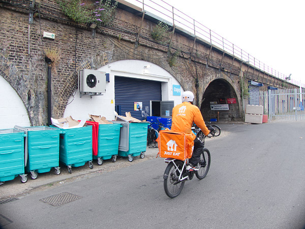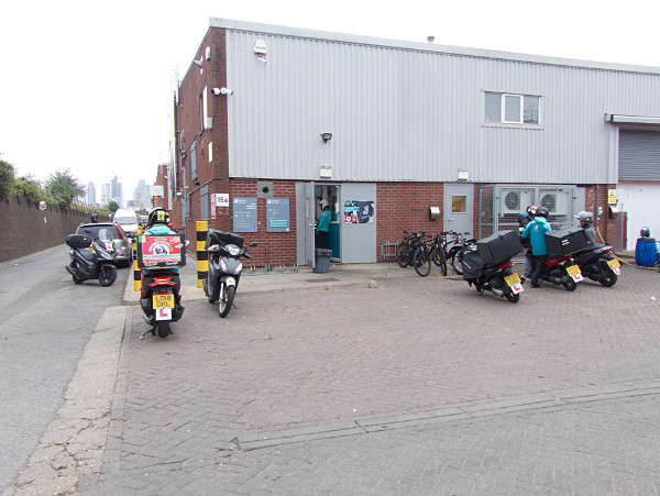 We walk through the streets and past the railway lines. Along a lane, through a narrow gap under the railway lines. There is an endless circuit of mopeds and bicycles and small motorbikes. Built into the railway arch a set of bikes with ‘Zapp’ written on them. Despatch riders appear and drive away again every minute or so. They look to be representatives of every nation on earth. We walk under another bridge. There are more mopeds and bikes and motorbikes. In the industrial estate there are people making cheap meals with expensive logos and marketing slogans. One of the bike riders explains that he is Portuguese and speaks no English. We speak to another rider with a wide mouth full of teeth. He tells us that he drives here, picks up, goes to the customers. Then he comes back here, picks up, goes to the customers.