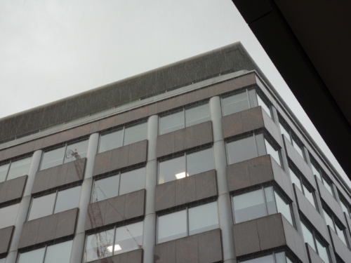A cloud burst and I sheltered in the service area of an office block near New Oxford Street. Big air conditioning units, waste bins with wheels, a security guard sitting in a box, a parcel trolley with a sign ‘Google deliveries here’. The rain became heavier, splashing on the puddles that quickly formed. The swish of car tyres on the wet roads. People walking past holding umbrellas, pieces of cardboard to shield their heads, or just walking in the rain getting wet.