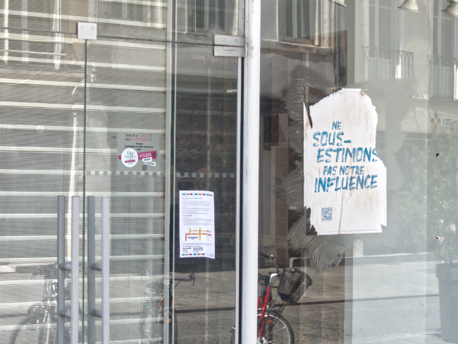 On the other side of the street there is what looks like a charity shop – (do they have such things in France?) or a second hand shop. Outside is a box which invites people to help themselves. A man is feeling the quality of a cream coloured blanked which he then puts into a light blue shopping trolley. And then some plates and finally a golden coloured cup. Perhaps its the Holy Grail.