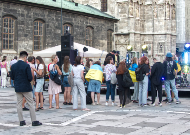 But Vienna is full of spies. Who is taking photographs of who? Are those two women Russian? Why are they taking photographs of the small group of people, some of whom are wrapped in Ukrainian flags?