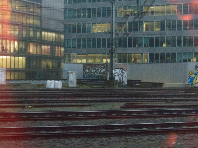 The train slows into a long glide through the industrial and working class suburbs of the city. The untidy world of production and productive workers. The electric light glare of office windows makes it possible to see into the office interiors.