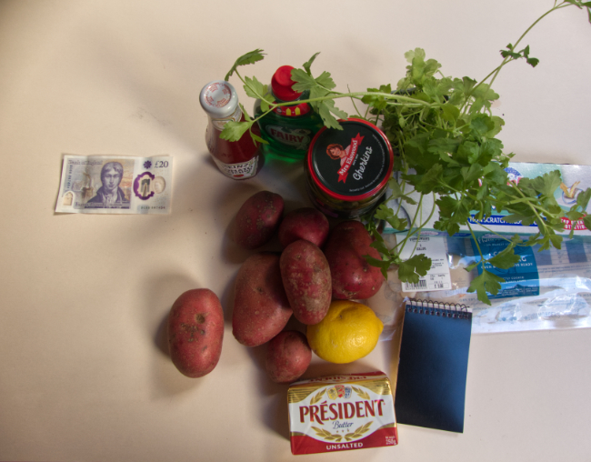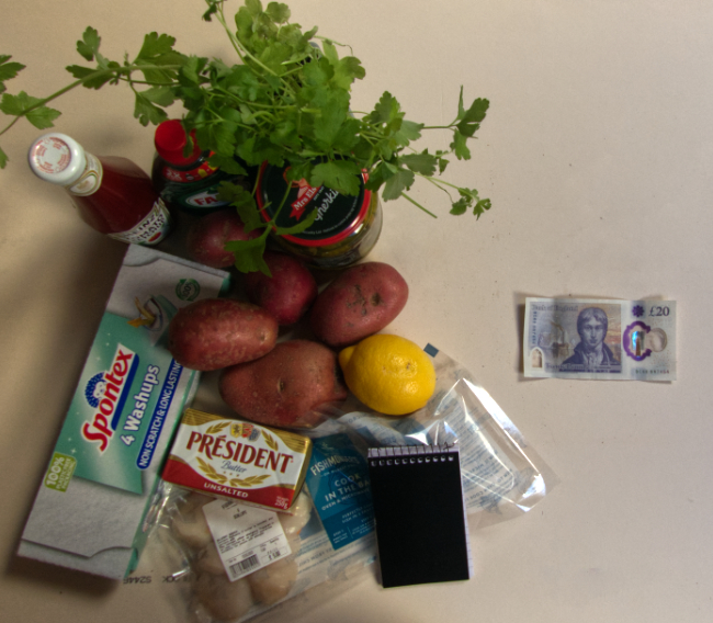 In my basket I have potatoes, a lemon, a pot of parsley, a pack of butter, four notebooks, a jar of gherkins, two packets of scallops, a bottle of tomato ketchup, a loaf of bread. Most of this is for my supper. I need to eat, as do we all.