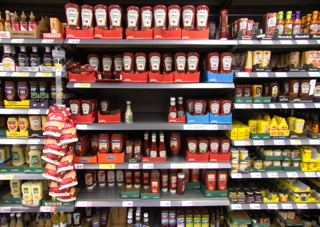 Here comes the lorry from the Heinz factory full of bottles of tomato ketchup. From a different direction, a lorry full of Mrs Elswood gherkins. A van load of Spontex sponges, another lorry, this time full of Warburton’s seeded bread, and then another stacked up with bottles of Fairy Liquid.