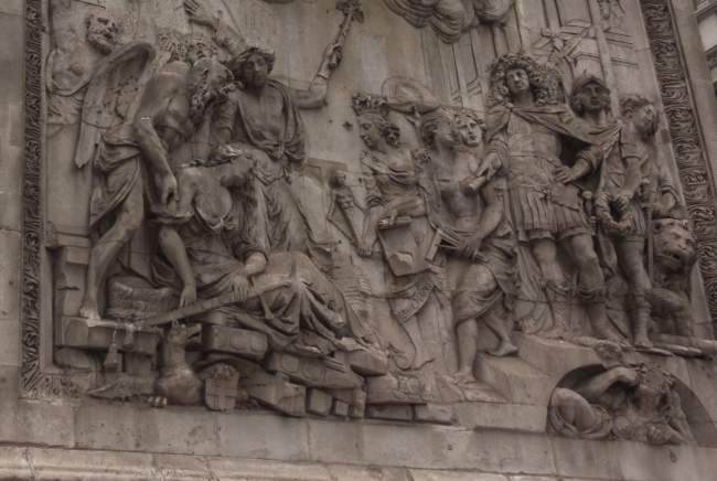 The Monument is a memorial to the Fire of London of 1666. The west panel includes Charles II wearing Roman dress. Perhaps the fate of his father encouraged imperial pretensions rather than kingly ones. This is one of the few monarchical symbols in the City; for it is a centre of financial, not regal power. Until 1811 there was an anti-Catholic slogan. A message of paranoid fear.