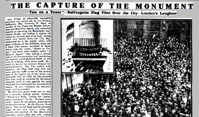 On Friday 18 April 1913, two Suffragettes, Mrs Gertrude Shaw and Miss Ethel Spark, ‘captured’ the viewing platform. They barricade the door at the top of the steps and unfurled a banner, ‘Death or Victory’. From this vantage point they threw leaflets to the increasingly large crowd below. They had carefully rehearsed this action with the use of a model of The Monument itself. 2