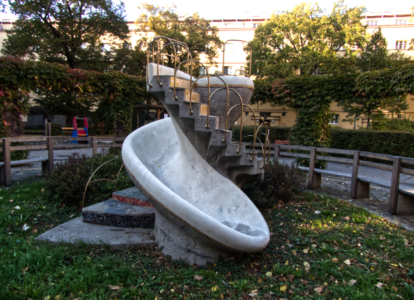 The kindergarten is still in use. These are impressive buildings in their own right and are part of the physical built commitment to improving the living conditions of working class people. Infant care, child development and support for teenagers were all taken seriously within the Red Vienna programme.