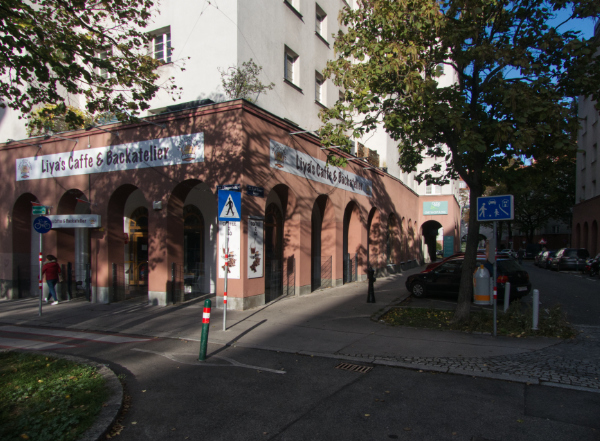 When you want to move on, come out of the estate at Karl Löwe Gasse. In front of you will see Wilhelmsdorfer Park. Walk across the park towards the corner on the right hand side. You will come to Deckergasse and Deckergasse school. Turn left into Längenfeldgasse. On the right hand side is Böckhgasse and Liebknecht Hof