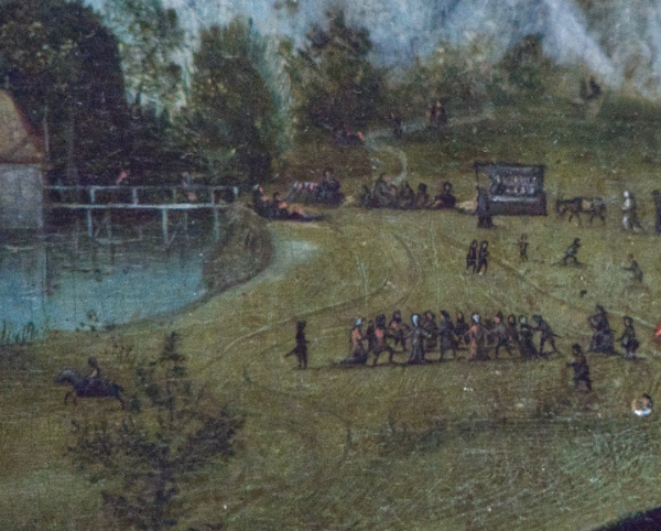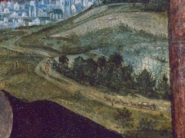 Clothe has been laid out on the grass, perhaps in the process of being bleached or dried. A wagon is being pulled by horses towards the city, someone is leading a laden donkey along the track. A group of peasants, they appear to be dancing. Perhaps dancing was part of production. Now dancing and production are very separate things.