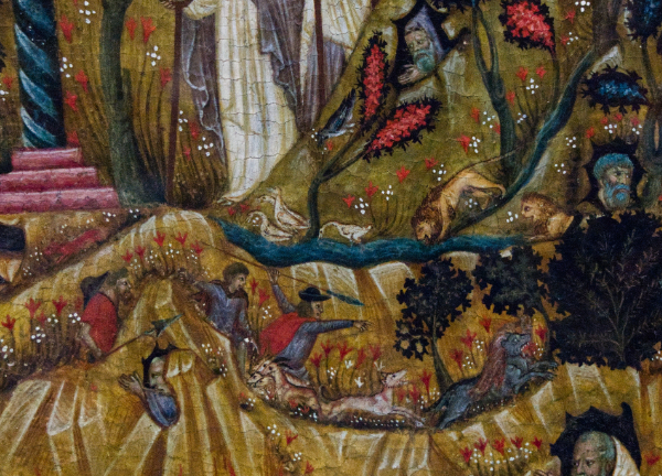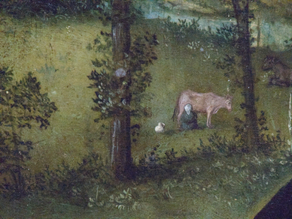 In the background a whole world of life and production. A woman milking a cow, someone pushing a wheelbarrow. A flock of sheep. People shaping stone (or wood?).