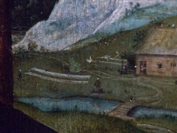 The formal landscape is fictional, perhaps the Ardennes, perhaps the Alps; perhaps a reference to the flow of trade between Antwerp and Augsburg, and then to Venice and the north Italian city states.
