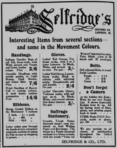 It has been suggested that Selfridges flew the flag of the WSPU (Women’s Social and Political Union) from the roof. There were certainly regular displays of purple, white and green (‘the colours’) in the windows and goods specifically aimed at Suffragettes and their supporters.