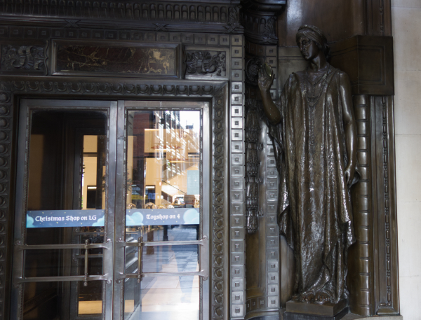 Above the main entrance is the statue of the Queen of Time, created in 1931 to mark the stores twenty-first anniversary. Take note of the figures on either side of the main doors.