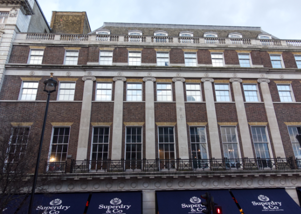 Retrace your steps back to Oxford Street. On the corner of Stratford Place and Oxford Street note the brown brick building with pilasters on your right hand side. It is currently (as of December 2025) a Superdry shop.